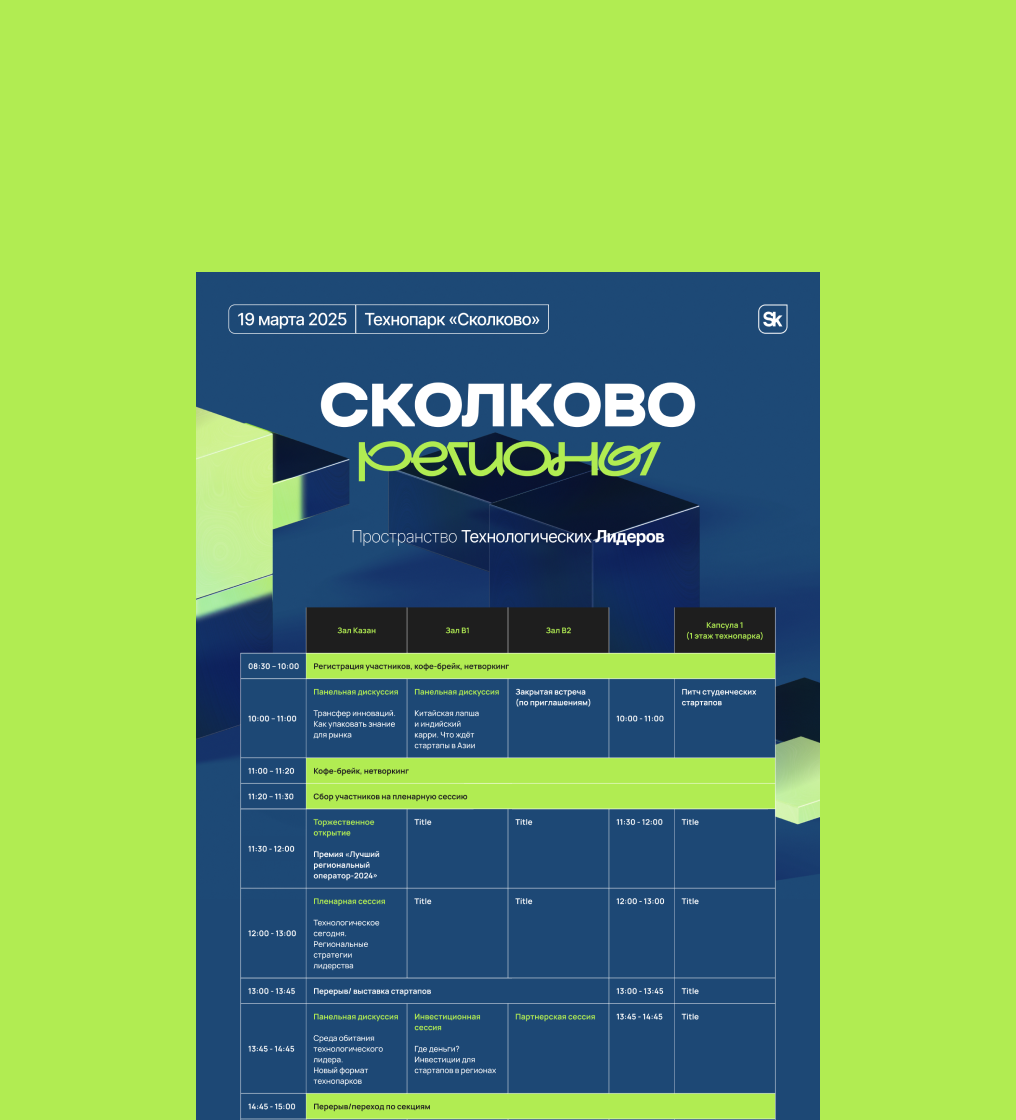 О проекте “Сколково Регионы 2025” — масштабное мероприятие, объединяющее представителей бизнеса, науки и инноваций. Дизайн должен был подчеркнуть прогрессивный дух события и соответствовать высоким стандартам бренда “Сколково”.