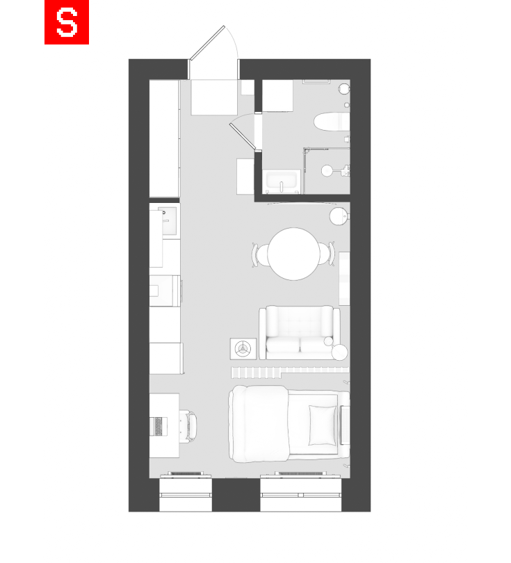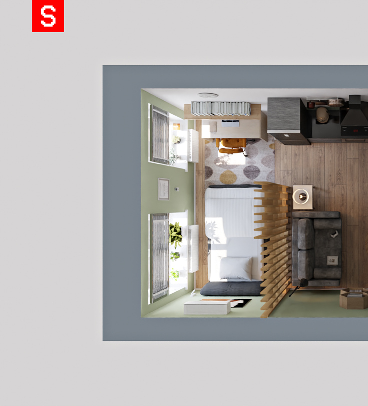 О проекте: Проект студии площадью 29,34 м² был выполнен для знакомого. Это была инициатива «для себя» — чтобы протестировать новое направление и развить навык интерьерного проектирования.